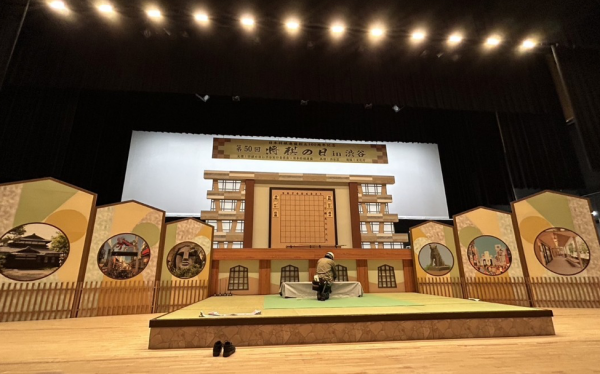 舞台上に設置された美術セット。 展示会やイベント会場装飾とは違い、独特な雰囲気が漂う空間装飾です。 この分野で使う用語も独特で、舞台中央から左側が”下手”右側が”上手”と 区別されます。 舞台中央に設置された座敷や後方に建て込まれた変形パネルや構造物は ”大道具”に括られます。 対して小物類に括られる絵画や花瓶などは”小道具”です。 食べ物は”消え物”…などなど、この業界の歴史を感じさせます。