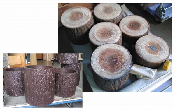購入した”切り株風”の素材にオイルペンキを塗装して仕上げました。 塗装といっても刷毛やガンスプレーといった道具を使わずに、ただひたすらに ウェスやスポンジを利用し、擦る叩くを繰り返し雰囲気を確認しながらの作業です。 ”切り株”の写真を手にし見つめては擦り、見直しては叩きの連続作業。 1本完成すれば残りは手慣れたものですが、ダメ出しを喰らいながらの作業に スタッフは辟易したかもしれません。 しかし納品時にはクライアント様から絶賛のご評価! やり切ったスタッフ、お疲れでした。 この繰り返しの作業でスキルが1段アップしたようです。
