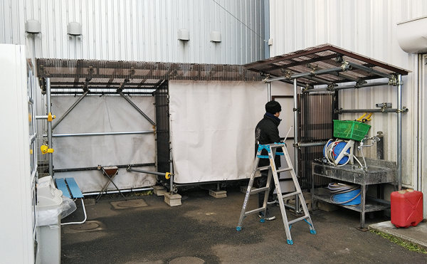 世の中、喫煙する方々の肩身がさらに狭くなってきております。 当社も"喫煙はこの場所で”程度の対応で雨が降れば傘を差しながら、風が強い 時には耐え忍びながらと…ただただ"吸う"場所の提供で終わってました。 しかし、喫煙者にも人権はございます。 そこで喫煙者の追いやられた感を払拭するために屋根付き喫煙スペースを作る こととしました。 会社資材を利用したものですが、屋根があるだけでもかなり落ち着きます。 一服休憩がこれまでと違って心に余裕を持たせる場所になれば幸いなのですが…。